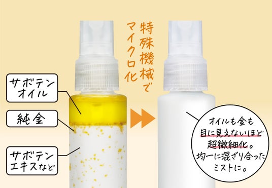 水分と油分は本来は互いに溶け合うことのない液体ですが、「ゴールデンオイルミスト」は日本に数台しかない特殊機械を使用することで、美容成分をまるごと目に見えないほどまで超微細化しています。