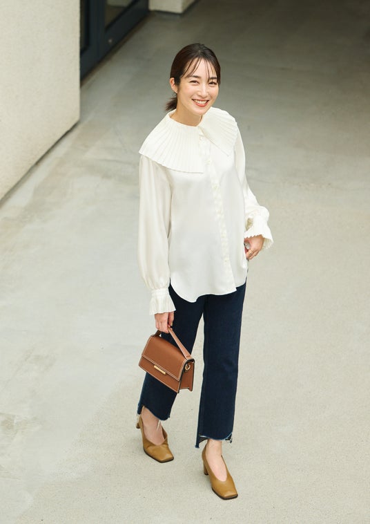 プリーツを施したビックカラーが印象的なとろみブラウス。