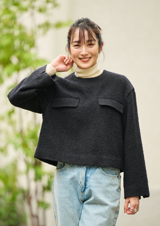 袖の立体フォルムやステッチを施したヨークなど、意匠性が目を惹くツイードトップス。