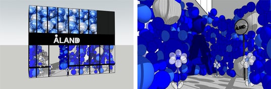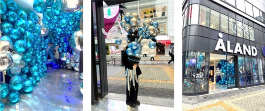 ALAND TOKYO店のエントランスには、ALANDのブランドカラーのブルーを基調としたバルーンでブランドの世界感を演出。ご来場いただいたお客さまと一緒に4周年をお祝できるフォトスポットを多数設置しました。
