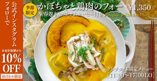 「喜多方ラーメン坂内」をはじめ、国内外で幅広いジャンルの飲食店事業を手掛ける株式会社麺食(本社:東京都品川区、代表取締役社長:中原 誠)が運営する『ヴェトナム・アリス』は、2024年秋メニューとして「かぼちゃのフォー」をランチタイム限定でご提供いたします。さらに、ハロウィン特別企画として、10月31日(木)限定、公式インスタグラムフォロワー様向け特典企画を開催いたします。