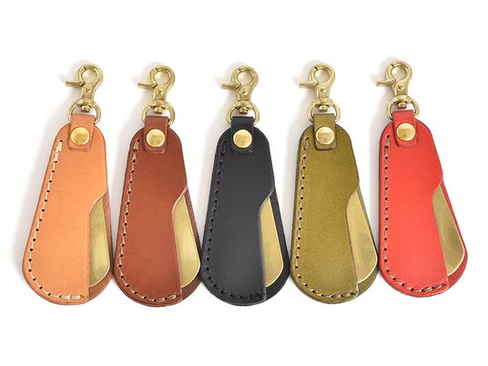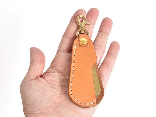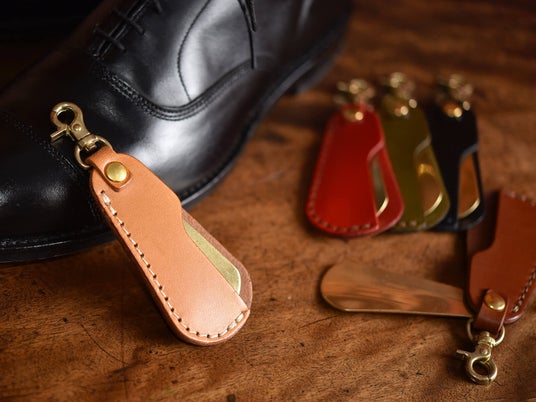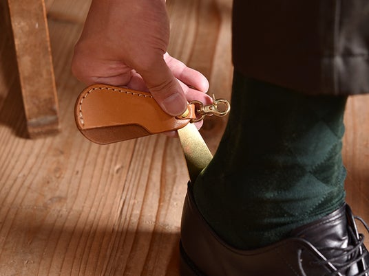 シューホーン本体は真鍮製で、ヘルツで使用しているオリジナルレザーで作ったカバーを付けています。靴を履く時は、シューホーン本体をスライドさせて引き出して使います。
