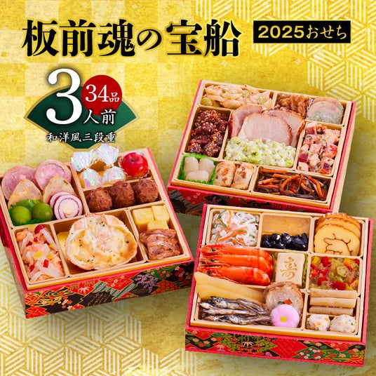 【さとふる限定】板前魂の宝船 おせち 和洋風 三段重 6.8寸 34品目 3人前