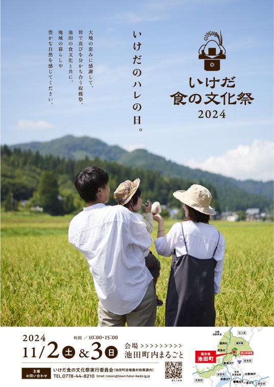 福井県池田町は令和6年11月2日(土)・3日(日)の2日間、町内全域で「いけだ食の文化祭 2024」を開催します。周囲の山が鮮やかに色付く紅葉の時期、自然の中で池田町の豊かな食文化を味わってください。