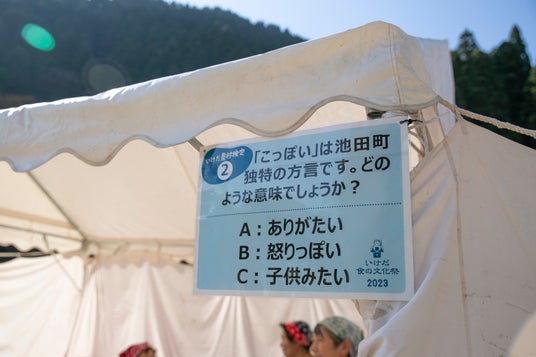 店舗の看板や窓口に、池田独自の方言や食べ物、取り組みなどについてのクイズを設置します。池田町民であれば分かる問題も多いので、出店者や来場者に声をかけて聞いてみてください。正答数に応じて景品をプレゼントします。解答用紙は本部(池田中学校駐車場)とお店案内所(まちの駅こってコテいけだ、道のオアシスフォーシーズンテラス)と各店舗にて配布予定(回収は本部とお店案内所のみ)。
