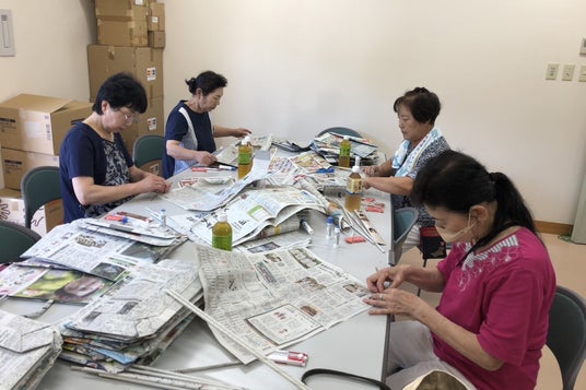 環境に負荷をかけるプラスチックごみを削減するため、池田町婦人福祉会の協力を得て、「新聞紙マイバック」を200個手作りしました。本部(池田中学校駐車場)とお店案内所(まちの駅こってコテいけだ、道のオアシスフォーシーズンテラス)にてアンケートにお答えいただいた方にプレゼントします。このバックを持って、町内のお店を巡ってください。