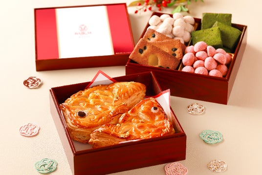 みんなが集まる年末年始を華やかに彩り、笑顔で味わうスイーツのおせちをと、試行錯誤を経て完成させた二段重です。とりわけアップルパイ職人の技を余すところなく発揮した、夫婦鯛は、ひとつひとつ丁寧に作り上げております。