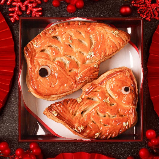おめでたい鯛の形のアップルパイが、仲良く2匹並んでいます。