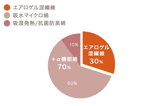 この素材は、驚異的な軽さと断熱性を誇るエアロゲルをポリエステルに組み合わせた〈エアロゲル混合繊維〉、〈吸湿発熱綿〉、〈吸水マイクロ綿〉を一体化したものです。
