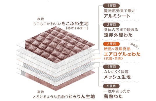 『mocoair 5層掛け布団』は、独自開発の新素材”エアロゲルα綿”を始めとする5つの層で構成されています。