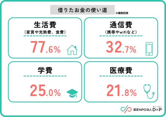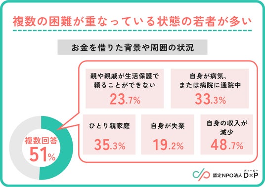 また、D×Pには病気で働けなくなり収入がなくなった若者の声も頻繁に届きますが、本調査では「自身の病気・通院」を背景にお金を借りた方が33.3%という結果になりました。