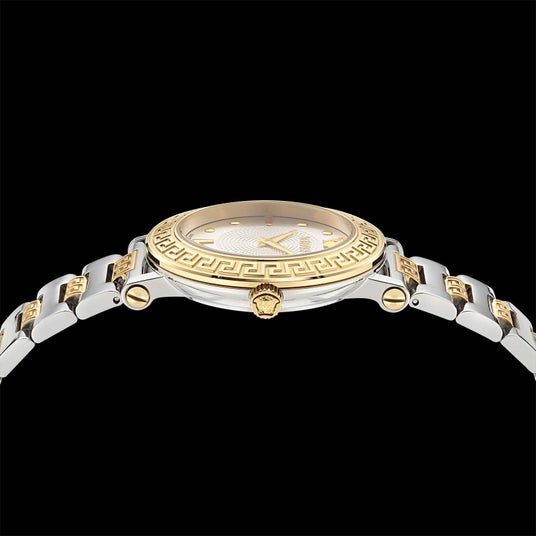 スフィアの名の通り「球体」を想起させるなめらかなフォルムに、Versaceを象徴するモチーフを散りばめました。サンレイ仕上げの文字盤の12時位置にはメドゥーサとロゴを配置。テキスタイルのように編み込んだステンレススティール製ブレスレットとベゼルをグレカ模様で飾り、色あせないエレガントなスタイルを表現しています。
