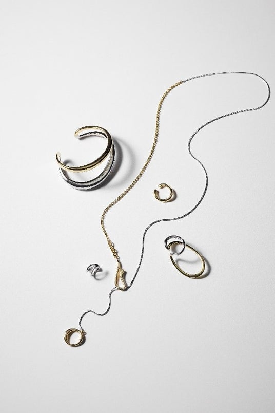 ゴールドとシルバー、両方のメタル感を楽しめるコンビカラーのデザインで、どの角度から見ても曲線になる滑らかなラインが印象的なネックレスです。