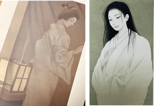 (右)日本画の伝統的なモチーフである幽霊画をイメージしたイラスト