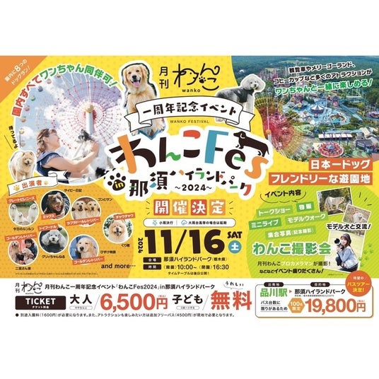 藤和那須リゾート株式会社(栃木県那須町/代表取締役社長:岩本 大二郎)が運営する“那須ハイランドパーク”では、2024年11月16日(土)に、『月刊わんこ』1周年記念イベント「わんこFes2024」を開催いたします。有名なわんこ達との交流会やトークショー、物販、ミニライブ、モデルウォーク、『月刊わんこ』プロカメラマンによる撮影会などわんこコンテンツが盛りだくさんです。今日のルンルンやグリィちゃんねるなどたくさんの有名わんこも参加予定。憧れのわんこに会えるかも!愛犬とイベントも遊園地も一日中楽しめること間違いなし!