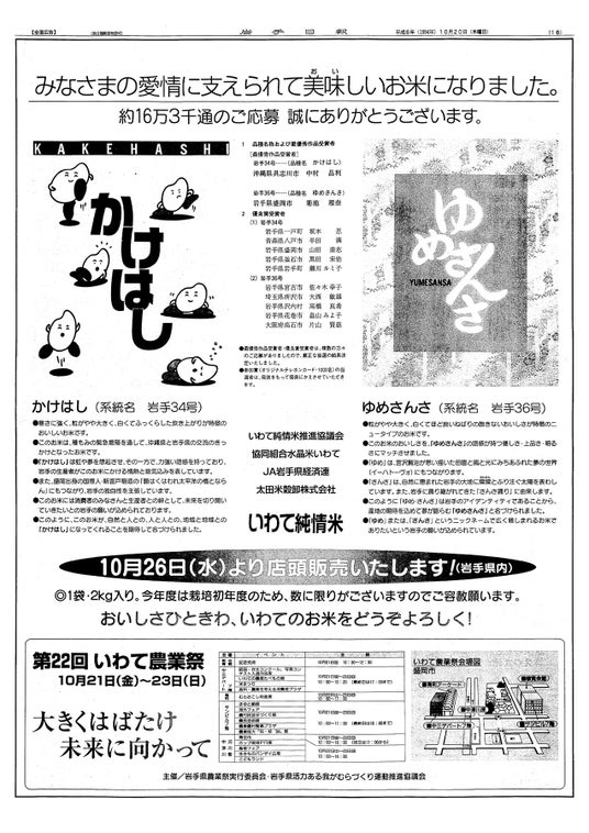 94年の秋は大豊作となり岩手34号は「かけはし」、同36号は「ゆめさんさ」と名付けられ、岩手県初のオリジナル水稲品種として消費者に届けられました。