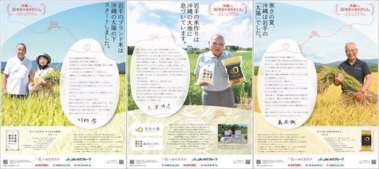 岩手日報、沖縄タイムス、琉球新報の3紙合同企画として、10月26日付け各紙に1ページ広告を掲出しました。岩手、沖縄の3人の生産者のメッセージを掲載。3紙並べるとアーチ状の“架け橋(かけはし)”が現れるデザインになっています。各紙面の“お米の便せん”は両県の絆と30周年のお祝いをイメージした、赤い糸(水引)でつながっています。各紙に登場する生産者は下記の通り。