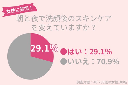 調査の結果、29.1%の女性が朝と夜で同じスキンケアを行っていることがわかりました。スキンケアの目的はあくまで保湿です。したがって、朝・夜のスキンケアで保湿がしっかりと行えていれば、全く問題ありません。