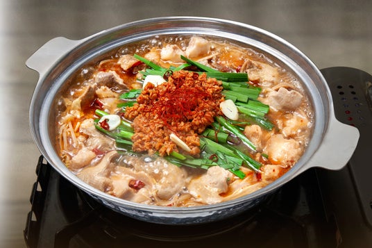 味噌ベースのピリッと辛いニンニクが効いたスープがモツに染み込んだ絶品鍋。