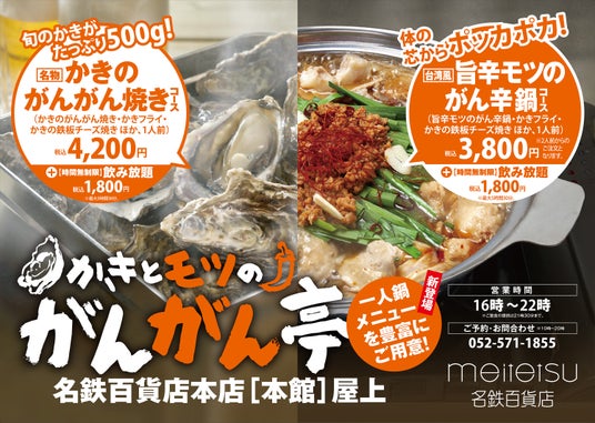 2014年よりスタートし、”冬のビアガーデン”としても人気の高い「かきとモツのがんがん亭」。広島産のかき料理とモツ鍋、豊富な単品・鍋メニューを楽しめるほか、”時間無制限”の飲み放題は今年も健在!