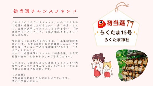 「本日時点で過去5回以上のご応募にもかかわらず初当選していない方の当選確率は95%以上」となります。これまで落選されていた方には、大変申し訳ございませんでしたが、ぜひ今回の15号にはご参加いただければ幸いです。