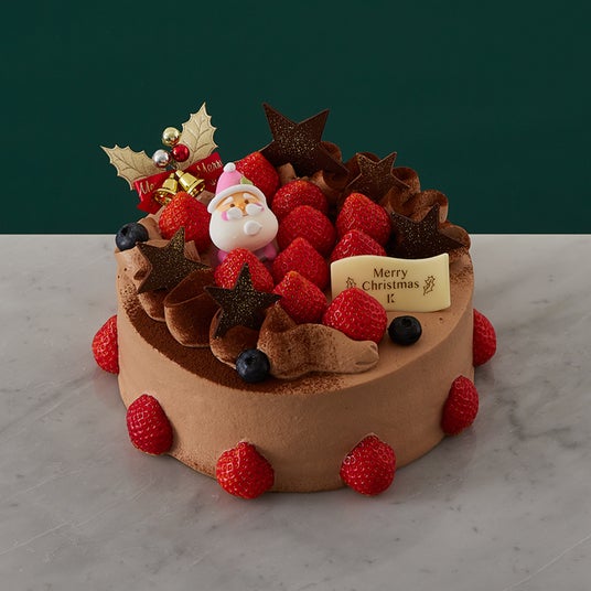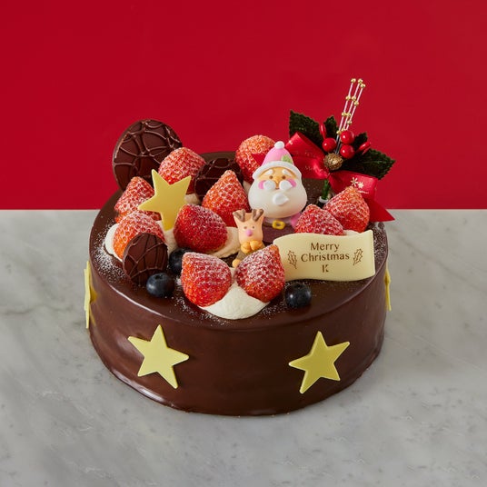 クリスマス チョコレートケーキスライスイチゴと生チョコクリームをサンドしたスポンジをガナッシュチョコレートでコーティング。仕上げには星のチョコとイチゴ、サンタで楽しく彩った口どけのよいクリスマスケーキです。