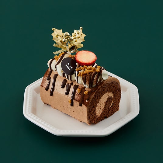 クリスマスブッシュドノエルしっとりとしたココアスポンジで軽やかな生チョコクリームを包み、生クリーム、苺、アーモンドクランチを飾りました。