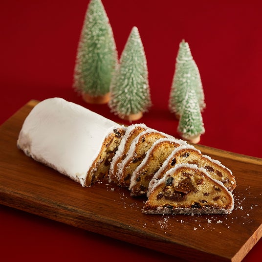 シュトーレン発酵パン生地にラムレーズン、いちじく赤ワイン漬け、オレンジピール、レモンピール、きざみアーモンドをたっぷり練り込んで焼き上げました。