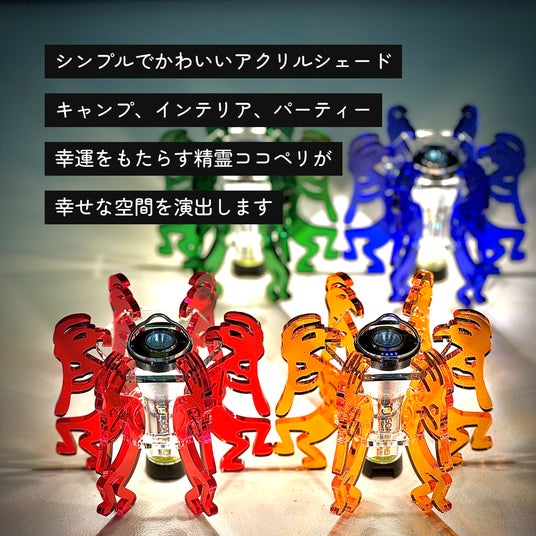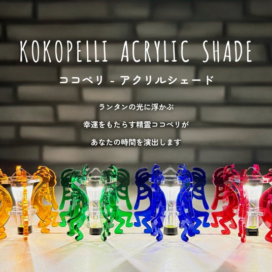 ココペリファン必見!アウトドアをもっと楽しく、もっとカラフルに彩る新商品「ココペリアクリルシェード」を新発売します。ネイティブアメリカンに伝わる精霊「ココペリ」をモチーフにしたかわいいデザインが魅力です。火を使わないランタンに取り付けるだけで簡単に使うことができます。灯りがココペリを照らし、キャンプサイトやお部屋を特別な癒し空間に変えてくれます。