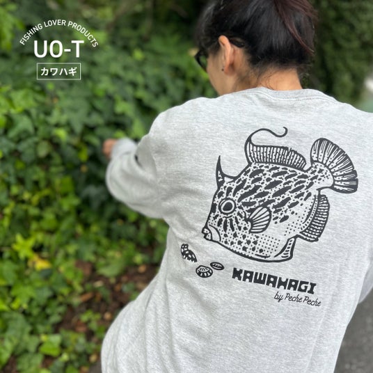「カワハギ」はミックスグレーのボディーに初の背面プリント。釣りをしている後ろ姿に注目が集まること間違いなし!