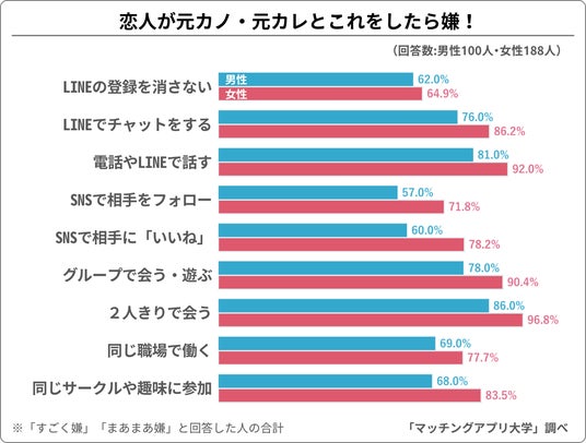 男性は86.0%、女性は96.8%が「元カノ・元カレと2人きりで会うこと」について「すごく嫌」「まあまあ嫌」と回答しました。