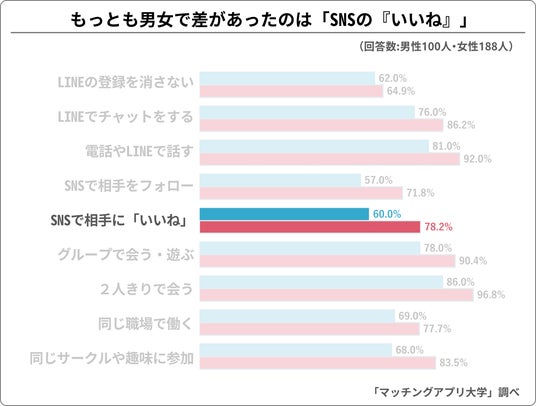 男女の差は9つの項目で平均11.6%。最も差が出たのは「SNSで元カノ・元カレに『いいね』をする」で、男性は60.0%が「嫌だ」と回答したのに対し、女性は78.2%と男女で18.2%の差がありました。