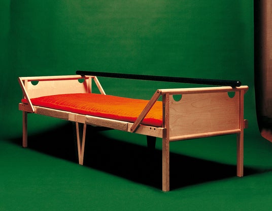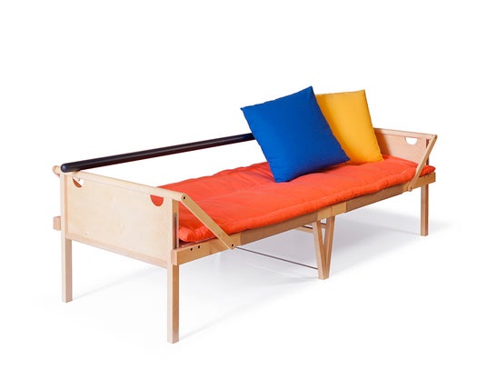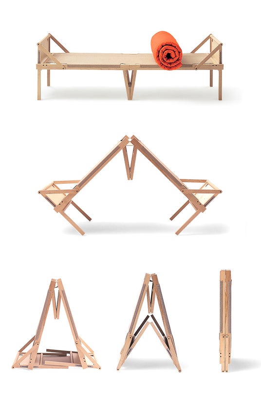 折りたたむと約13cm。簡単な手順でフラットに折りたたむことができ、脚やヘッドボードが格納されていく様にはバスキュール橋のような建築的構造美が感じられます。リビング空間でのソファやベンチとしての使用に留まらず、インナーテラスなどへのポータビリティ性を兼ね備えており、空間的制約という問題に対する合理的な機能を持つ製品です。