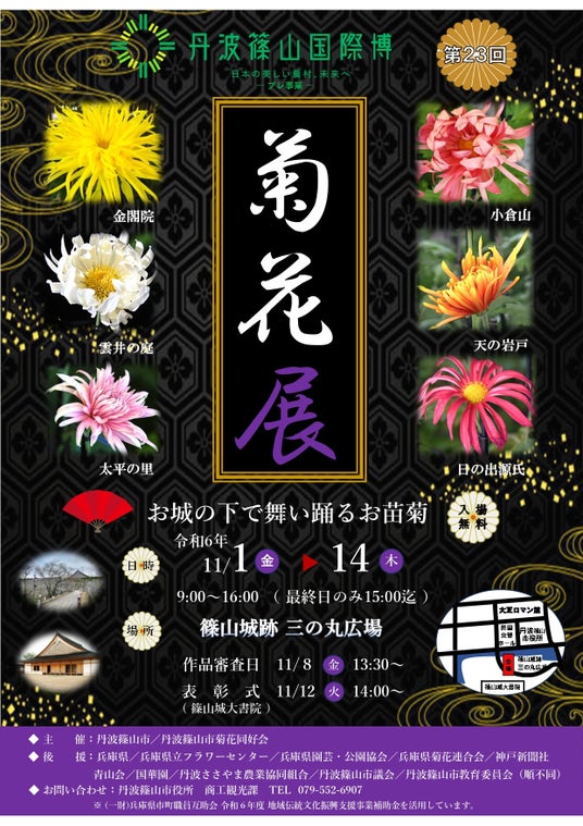 兵庫県丹波篠山における菊作りの伝統は古く、250余年の歴史があります。なかでも、丹波篠山だけに伝わる門外不出の「お苗菊(古典菊)」は、旧篠山藩主の青山忠良が江戸幕府から拝領し、家臣に栽培させたと伝わる伝統ある中菊。お苗菊を中心に、花同好会会員などが丹精込めて育てた大菊や菊の盆栽など約300鉢が展示されます(11月1日~11月14日)。