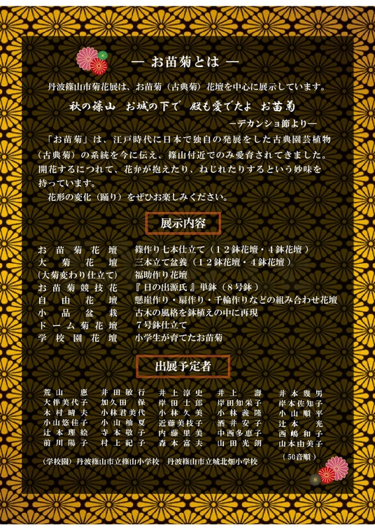 お苗菊は旧篠山藩主 青山忠良が1840年頃、江戸幕府から拝領し家臣に栽培させたと伝えられる中菊のことで、丹波篠山付近でのみ愛育されてきたことから「門外不出」の菊とされています。