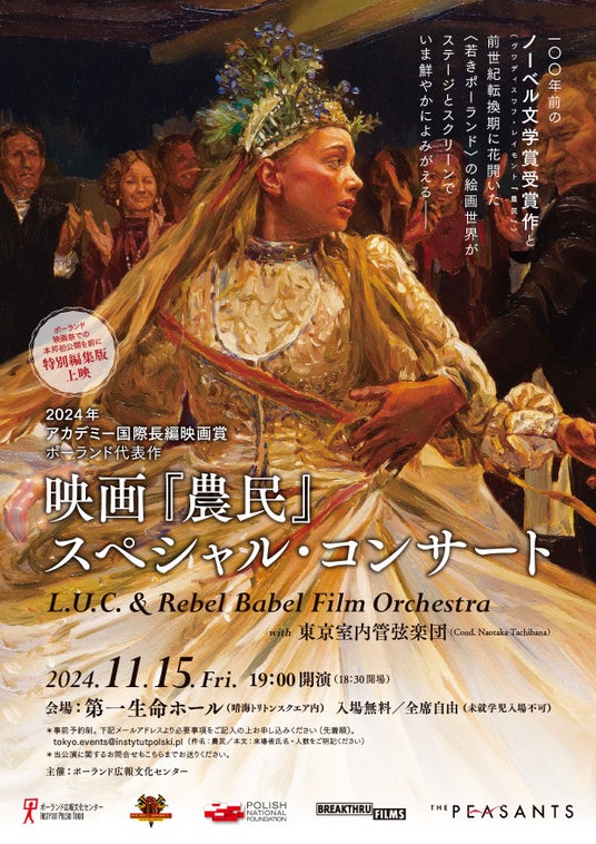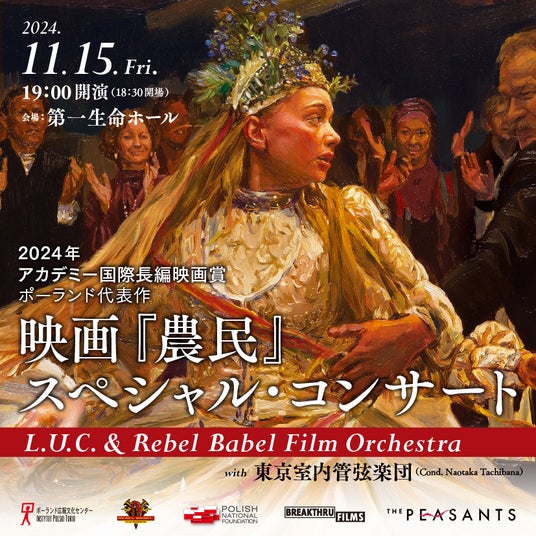 11月15日、ポーランド広報文化センターは、アカデミー国際長編映画賞ポーランド代表作(2024)『農民』の日本プレミア上映を記念して音楽と映像によるスペシャル・コンサートを開催する。特別編集版の映像をスクリーンでご覧頂きながら、本作の音楽を担ったウカシュ・ロストコフスキが自ら率いる楽団とともに映画の世界観を見事に描き出すサウンドを生演奏でお届けするもの。
