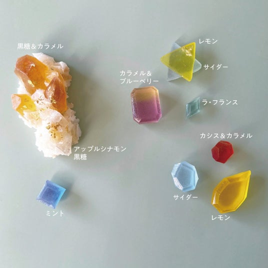 お馴染みの黄色いトパーズの他に、希少なブルートパーズもお菓子の表現に加えている。色ごとに味が違うので、なるべく色々な種類の味が入るようにしている。