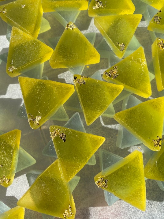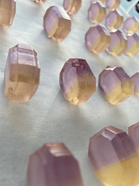 日本の伝統的和菓子、琥珀糖を手斬りの技術で宝石や鉱物のように形作っていきます。