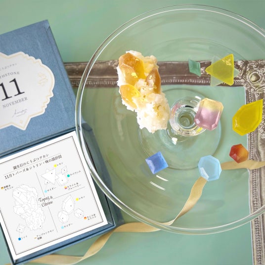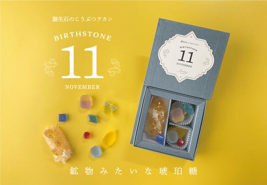 1ヶ月間しか作らない琥珀糖こうぶつヲカシの人気の誕生石シリーズに、11月の誕生石が登場。天然由来の食用色素を用いた多彩な色彩と、小刀でひとつひとつ切り出す宝石のような形が魅力の寒天菓子。