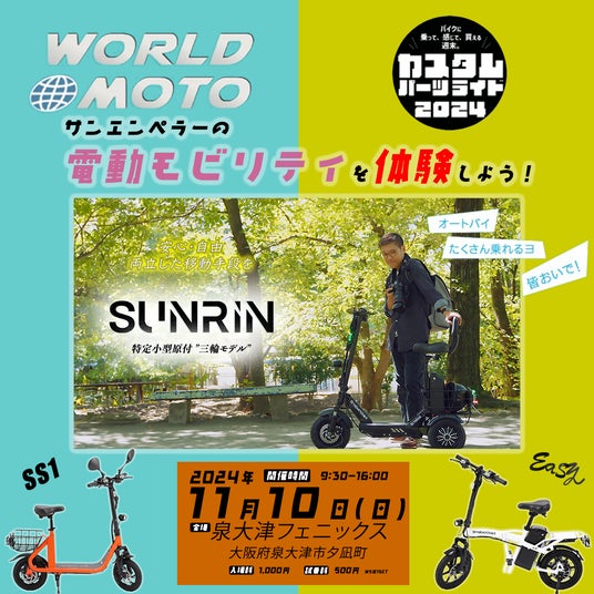 Sun Emperorが、11月10日(日)に泉大津フェニックスにて開催される「WORLDMOTO×カスタムパーツライド2024 in大阪」で試乗会を開催いたします。ぜひお立ち寄りください!