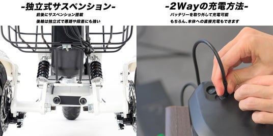 ・前後輪サスペンション搭載。後輪は独立式サスペンションで悪路にも強い
