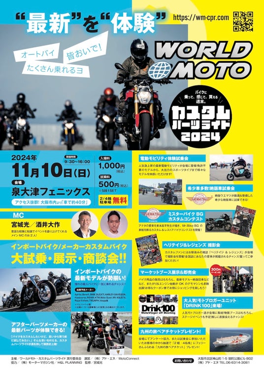 2024年11月10日(日)に泉大津フェニックスにて開催される、カスタムパーツビッグイベント「WORLD MOTO×カスタムパーツライド2024 in大阪」が開催!