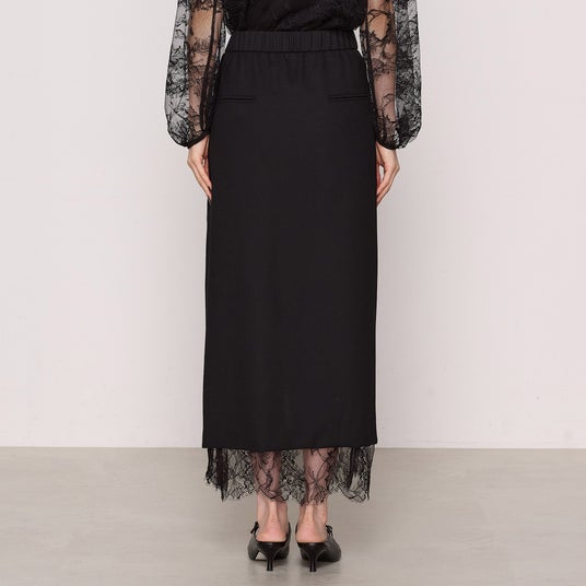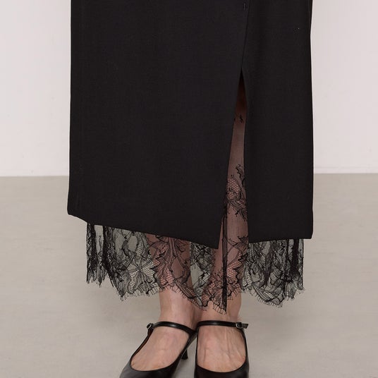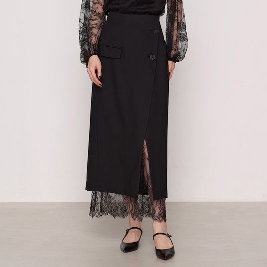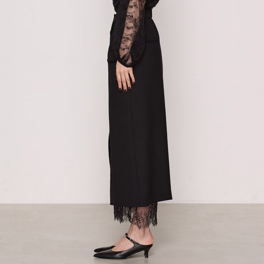 – マニッシュな雰囲気の巻きスカートに、フェミニンなリバーレースをペチコートとしてドッキングさせ、裾からのぞかせるデザインにしています。