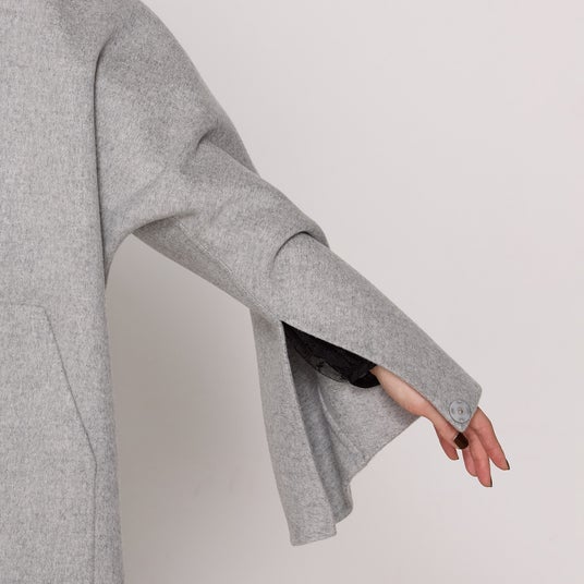 – 袖口はたっぷりと幅広く、袖下にスリットを入れた大胆なデザインです。袖口にスナップがついているので、コーディネートや気温に合わせて開閉でき、折り上げもできる仕様にしています。