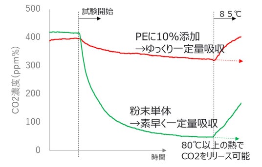 樹脂中にCO2吸収剤があることで、CO2吸収剤(単体)のみよりもゆっくり吸収します。※測定はジプロックにCO2センサーと材料を入れて測定