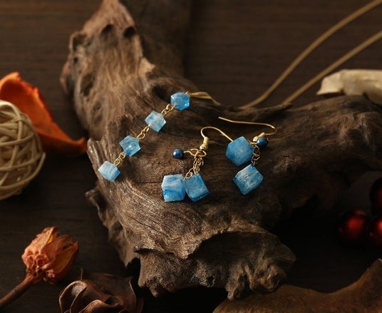 製品写真(ピアスとネックレス)。大気をイメージした青と、雲をイメージした白色の部分。CO2吸収材は白色部分に多く入っています。