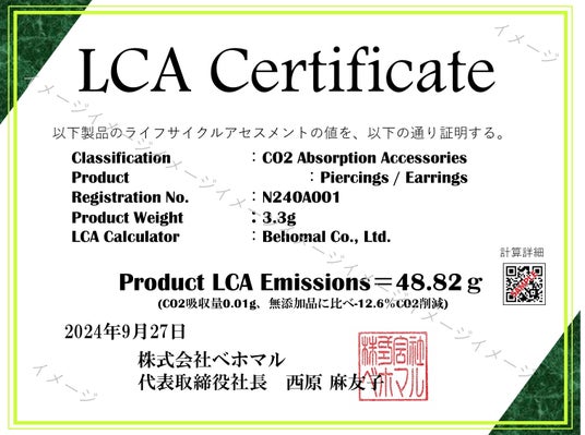 美環はCO2吸収だけではなく、製品製造時のCO2削減ももたらします。植物由来原料の添加によって、環境負荷の高い石油由来材料を減らすことができます。結果、通常のアクセサリーと比べ、製造過程で排出するCO2を12.6%削減することに成功しました。削減効果の計算は、立命館大学・山末英嗣教授(エネルギー・資源循環工学)との共同研究により、ライフサイクルアセスメント(LCA)という環境性評価理論により算出し、実証しています。算出されたCO2排出量をLCA証明書としてアクセサリーに添付し、品質と安心をお届けします。