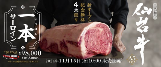 仙台牛一頭分のサーロインを丸ごと一本(※約12kg、個体差あり)、4本限定で販売いたします。一本そのままでご購入いただけるのはもちろん、ステーキカットしてのお届けもできます。配送日は3ヶ月先まで指定可能で、クリスマスや年末シーズン、大人数のイベントなどに合わせてご購入いただけます。