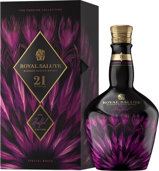 『ローヤルサルート21年 ハリス・リード エディション』は、ハリス・リードのオリジナリティあふれる創造性がボトルデザインだけなく、ウイスキーのブレンドにも注ぎ込まれた商品です。ボトルデザインは「ローヤルサルート」の伝統から「王冠」の概念を再解釈し、象徴的な羽根のヘッドピースでボトルを優雅に飾った魅惑的なデザインです。日本国内市場ではゴールドとパープル(※1)の異なるボトルカラーの2アイテムを展開します。中身のウイスキーは、ハリスがストラスアイラ蒸留所を訪れ、「ローヤルサルート」マスターブレンダーのサンディ・ヒスロップとのブレンディング・セッションで、ハリス自身が好みのスタイルや味を伝えて造られた新しいブレンドです。リッチでユニークな味わいをお愉しみいただけます。