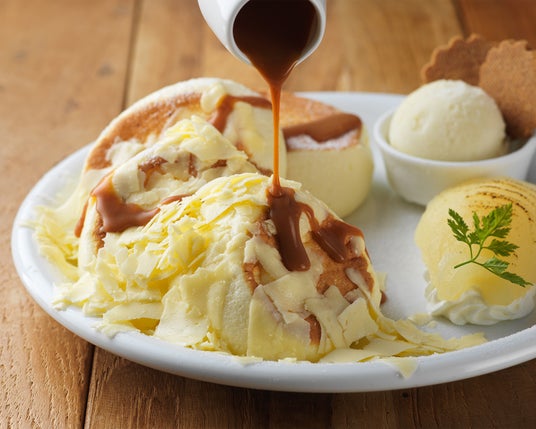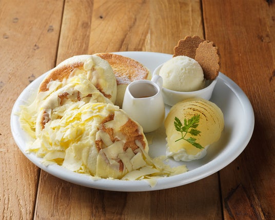 バターとキャラメルの濃厚な味わいに、さわやかな洋梨がアクセントになるパンケーキです。